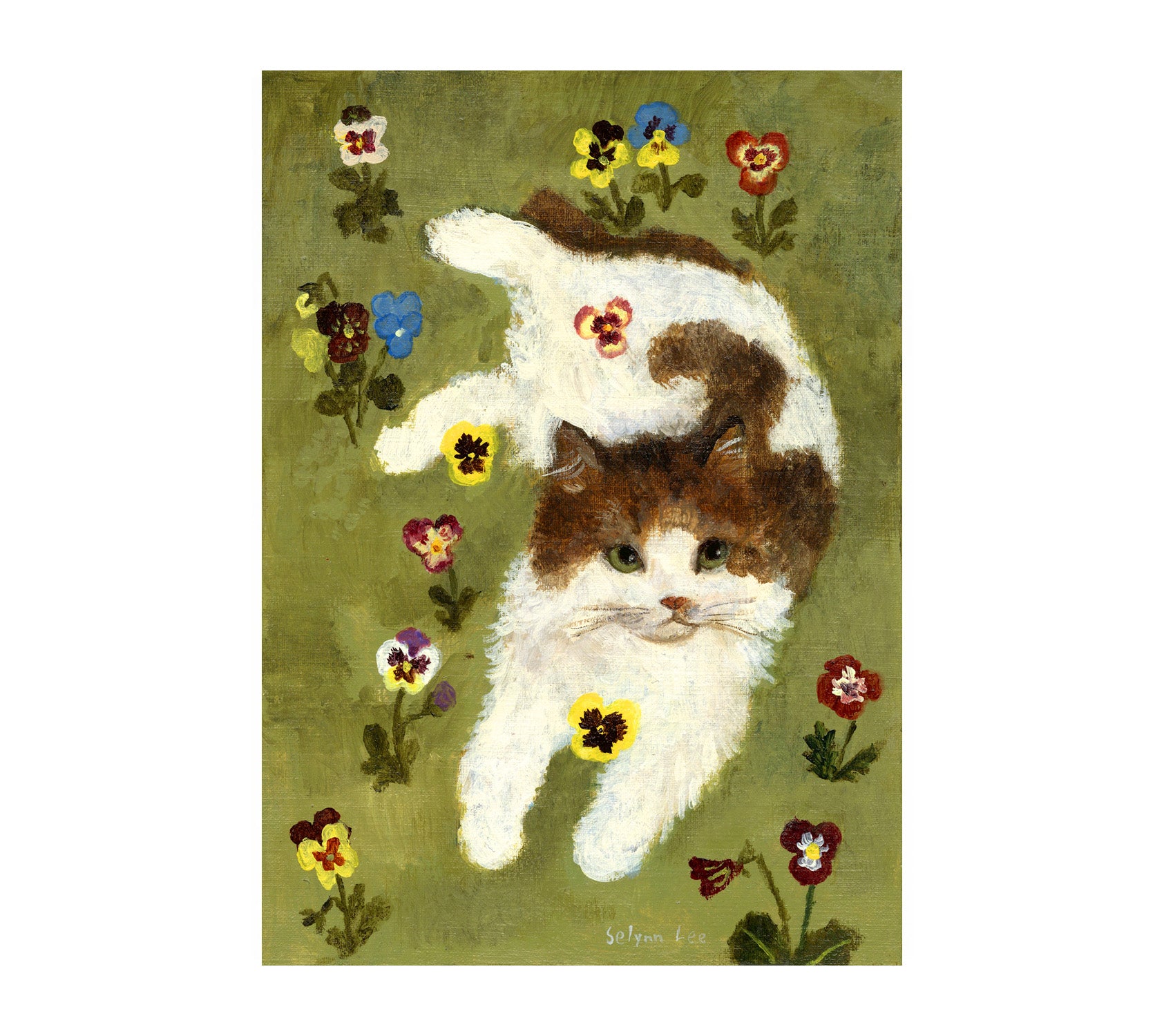 A cat and pansy flowers